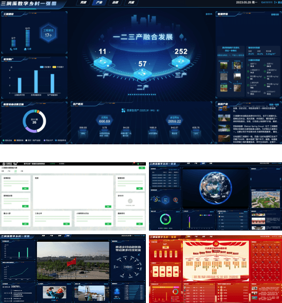 主要圍繞黨建、產業、治理、共富四大主題,采用統一三方數據對接,智能表單數字填報,生產/安全監控視頻管理,數字vr等技術手段,實現了數字黨建,活動引領,智慧文旅,勞動共富,智慧產業(種養殖及一三三產)等三澗溪村個性化場景展示,“小屏幕大村莊,一眼盡覽”。
